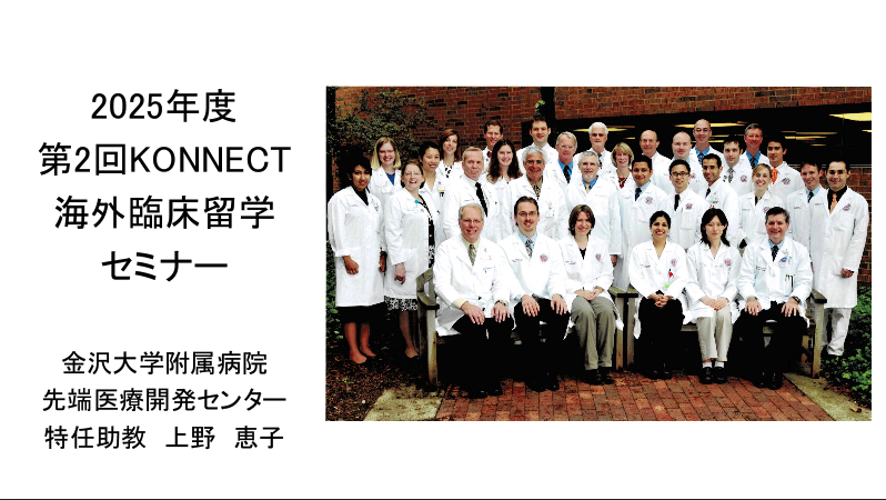 10月15日に金沢大学医学類サークルKONNECTが主催する「第2回海外臨床留学セミナー」で講演をしました。医学部時代の留学やアメリカ臨床留学を中心に、現在の仕事までを振り返りました。これまで自分の軌跡をまとめたことがなかったので、昔の資料や写真など掘り起こしてかなり調べました。自分の半生を振り返るいい機会をいただきました。学生さんたちにとって、キャリア選択や今後の生き方で少しでも参考になれば幸いです。